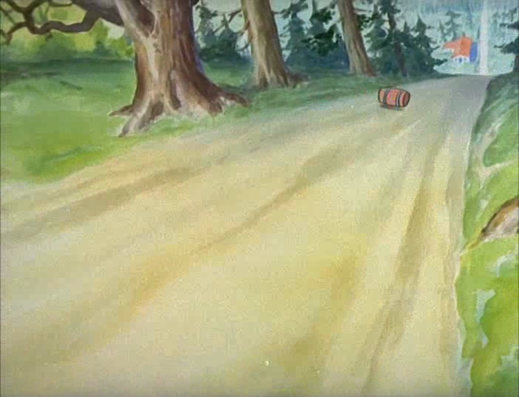 Cut to a shot at the bottom of the hill. It turns out that Screwy is playing the snare drum. Not only that, he provides musical sound effects. When the barrel hits a tree, Screwy bashes a bass drum. Meathead flies up into the air and down. Screwy plays a slide whistle to accompany the action. When Meathead lands, Screwy bashes the bass drum again, then finishes up with a bird twitter as Meathead lays on the ground, dazed.