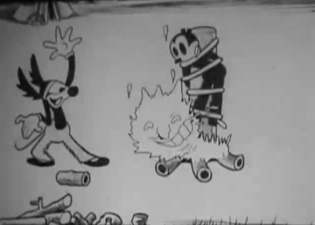 That talented feline, Krazy, contributes another fun fest in this account of his hunting trip on Indian land. He is captured by the Redskins, who proceed to burn him at the stake, but the invincible cat escapes himself and turns the tables on his captors, whom he charms and soothes with music. Hits the intended spot.