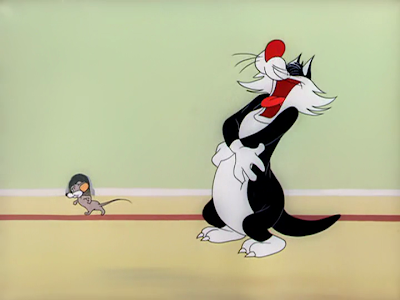 This is from “Hippety Hopper,” the second cartoon featuring the Sylvester, a “giant mouse” and a huge bulldog that keeps throwing Sylvester back in the house. Here are consecutive drawings (on twos) of Sylvester laughing and the theme “You Never Know Where You’re Going ‘Til You Get There.”